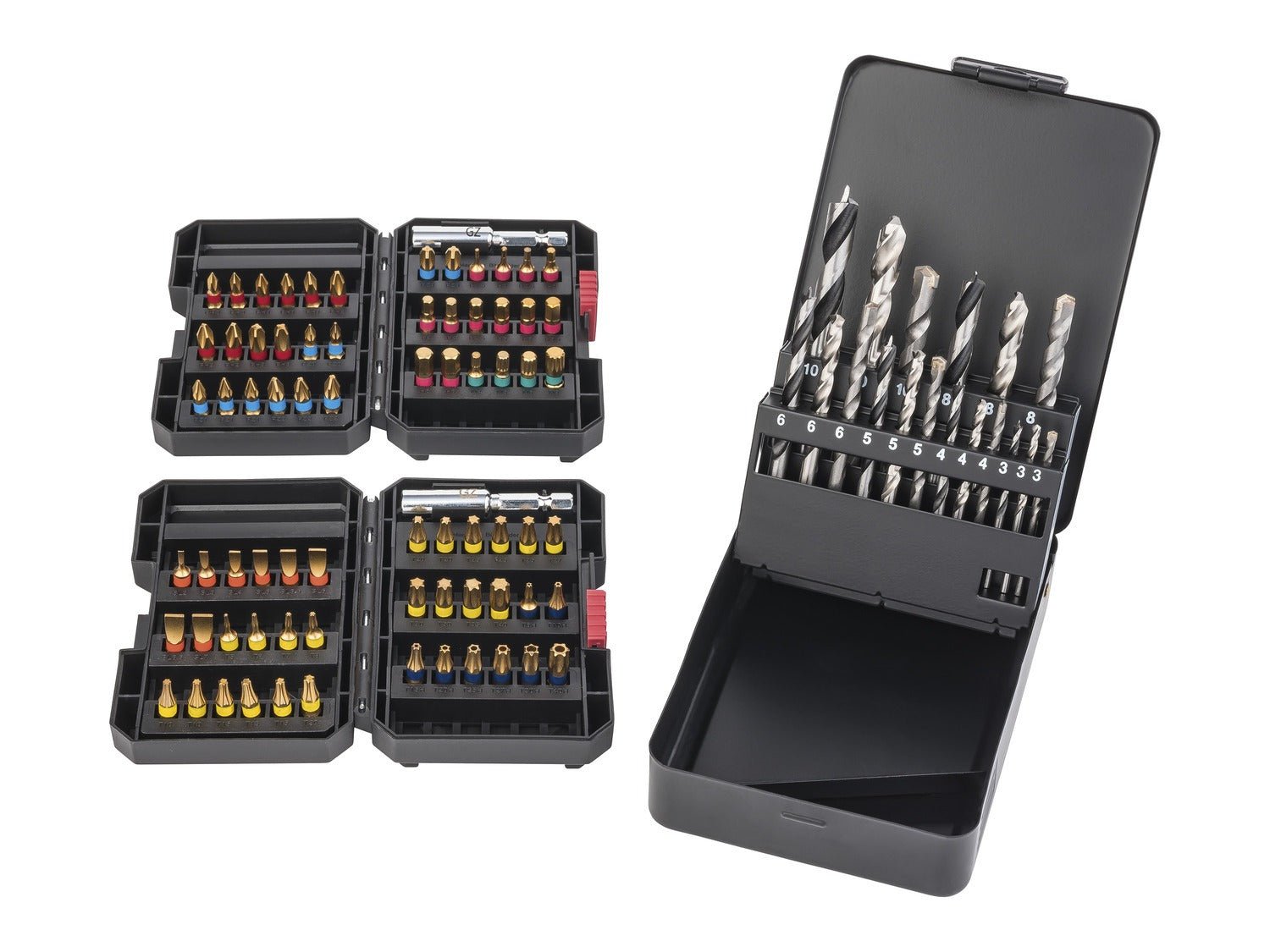 Accessori inclusi: 1 impugnatura supplementare, 1 asta di profondità, 1 taglierino (con 8 lame), 1 metro a nastro (3 m), 1 cacciavite a cricchetto (¼”), 1 portainserti per cacciavite (¼”), 6 punte per legno, 6 punte per metallo, 6 punte per pietra, 2 portainserti (60 mm), 72 inserti.